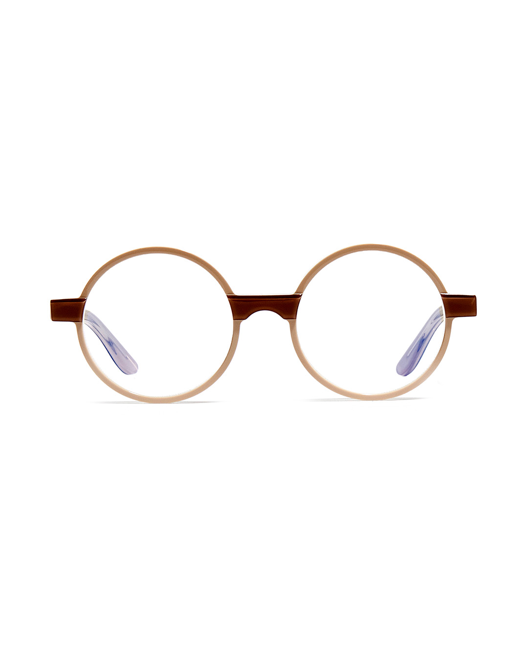 Montura redonda y armónica en acetato brillante de alta calidad. Disponible en tonos arena con detalles visón o beige con detalles azules. Aportan comodidad visual y un toque de distinción a cada look. Estuche de microfibra incluido.