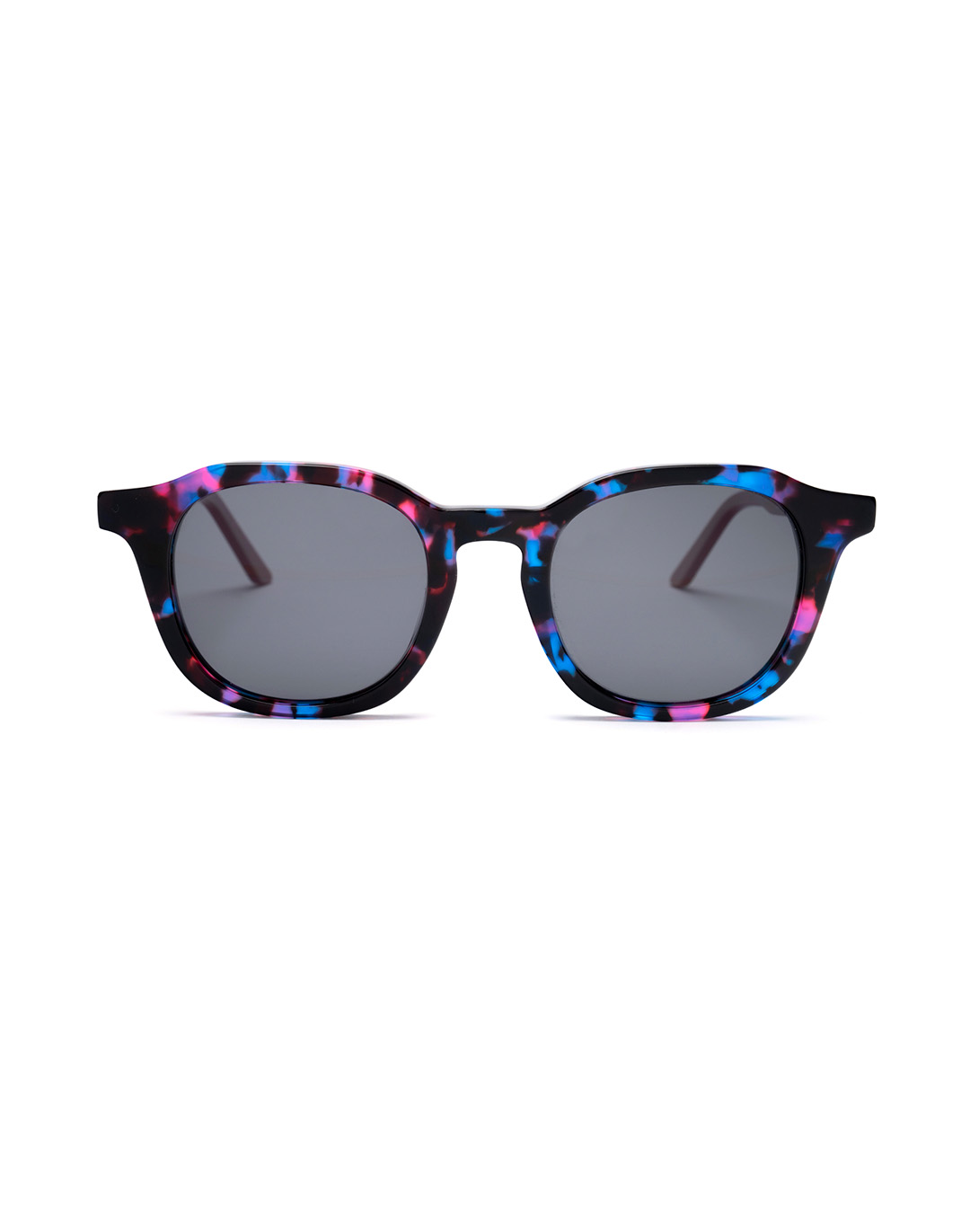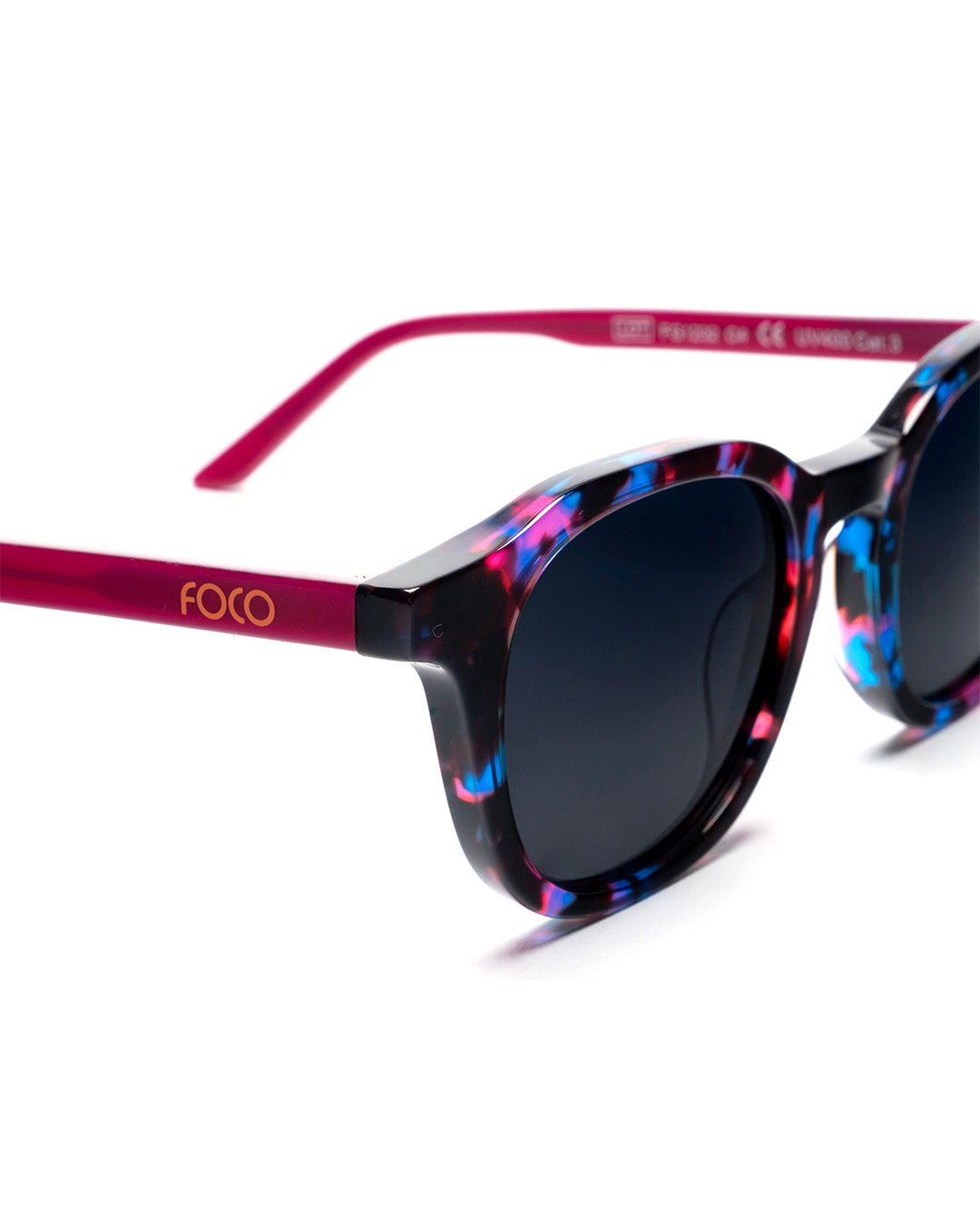 Un estilo dinámico y elegante a la vez. Montura redondeada de acetato multicolor en tonos azul y magenta, con varillas en contraste y lentes orgánicas polarizadas en gris oscuro.
